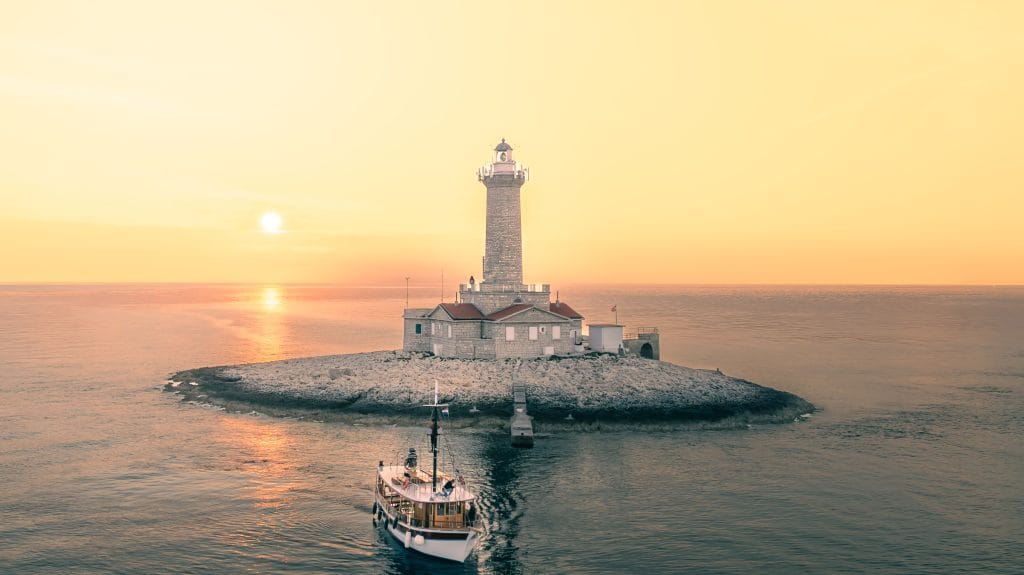 An der äußersten Spitze von Kamenjak, auf einer kleinen Insel, steht der Leuchtturm Porer. Er wurde 1846 während der österreichisch-ungarischen Monarchie erbaut. Dieser elegante, 35 Meter hohe Steinturm ist zu einem erkennbaren Symbol dieses Teils von Istrien geworden. Obwohl man den Leuchtturm nicht betreten kann, ist der Blick darauf vom Meer aus ein unvergessliches Erlebnis, das einen Besuch in Kamenjak perfekt ergänzt.